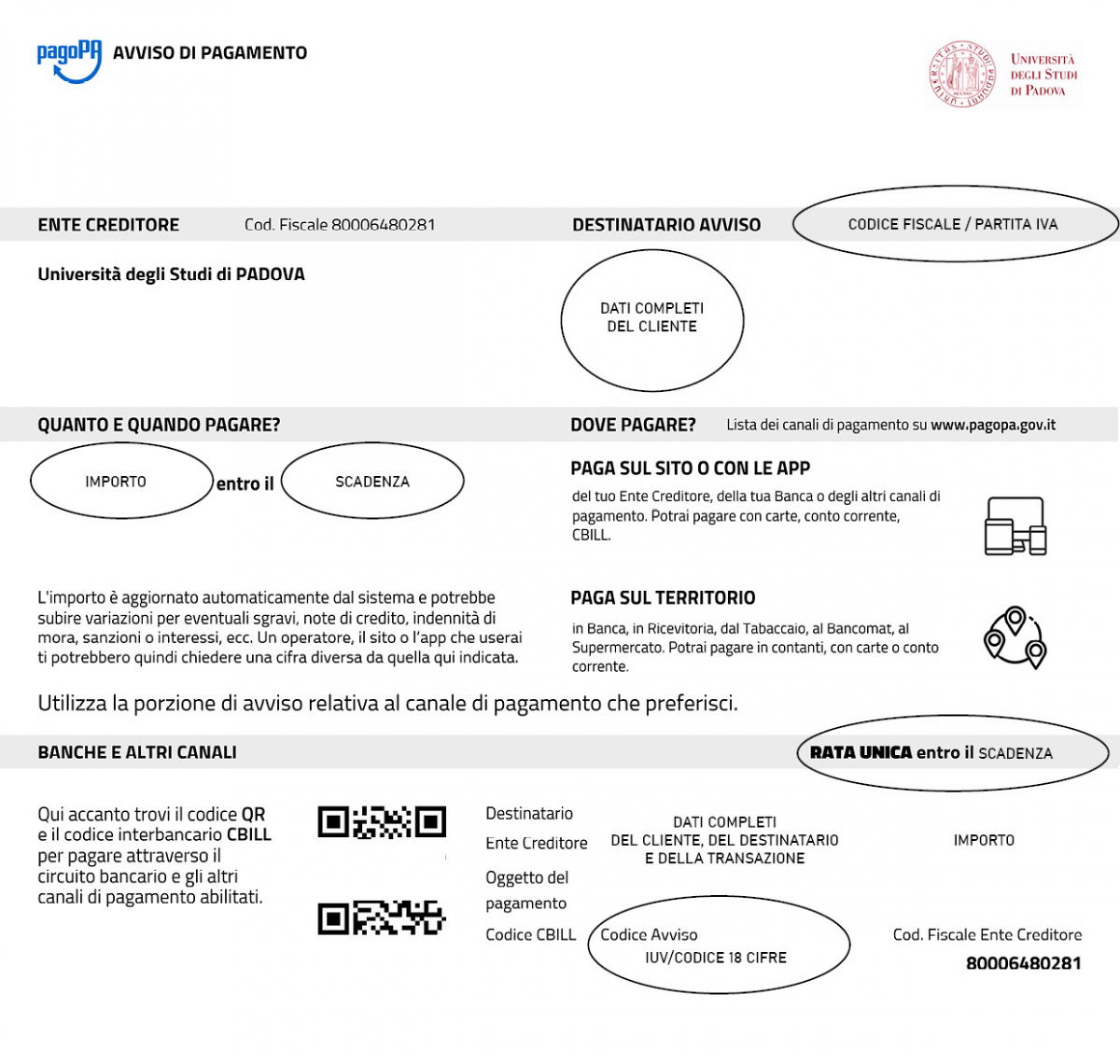 - Attraverso sito, app o portali telematici come: PagoAtenei(in questo caso la procedura avviene selezionando la voce “Ricerca codice avviso”) , i servizi digitali del proprio Ente Creditore, della propria Banca o degli altri altri canali di pagamento.